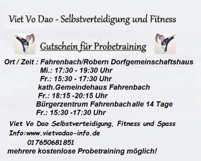 Jeden Mittwoch und Freitag im katholischen Gemeindehaus Fahrenbach und am Freitag auch in Limbach/Krumbach konnten die Teilnehmer die Vielfalt von Viet Vo Dao kennen lernen. In den Unterrichtstunden